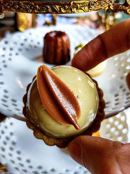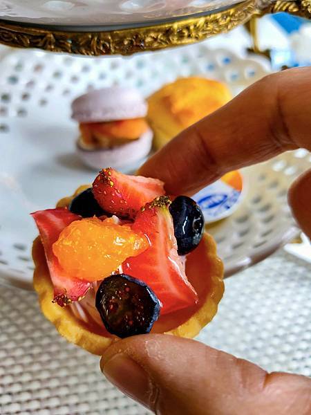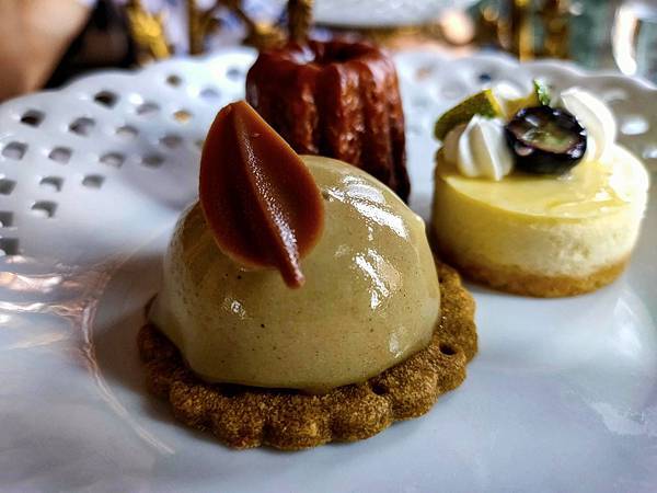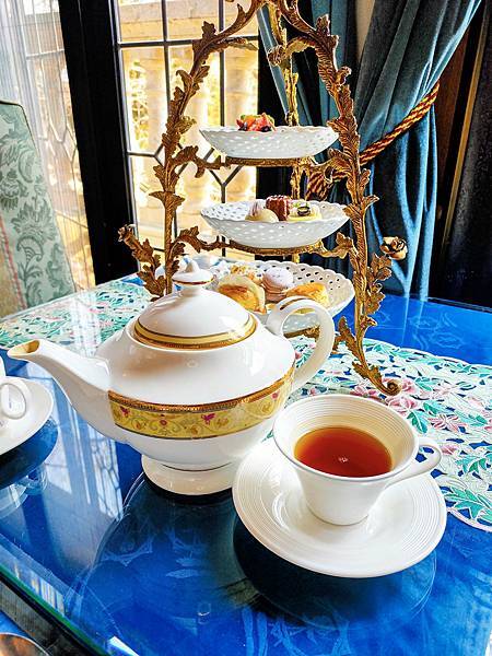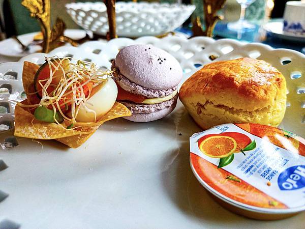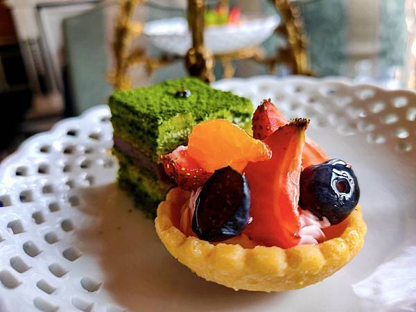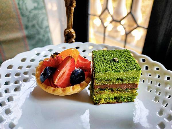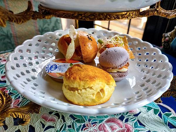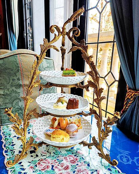 正統英式下午茶,三層點心盤有, 蘆筍鮮蝦塔、培根小漢堡、溫熱司康、水果塔、可露麗、抹茶歌劇院等看起來都好精緻。